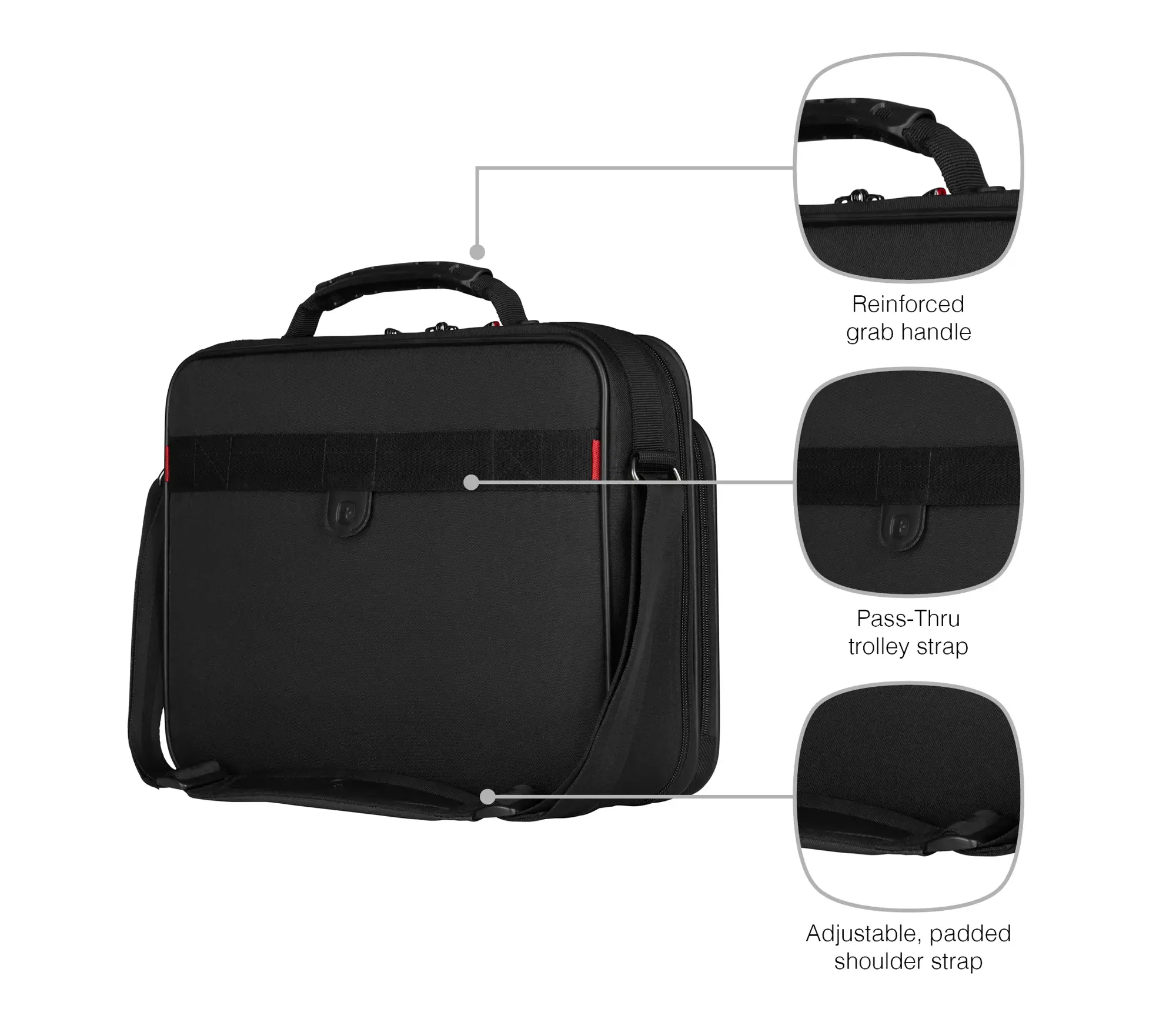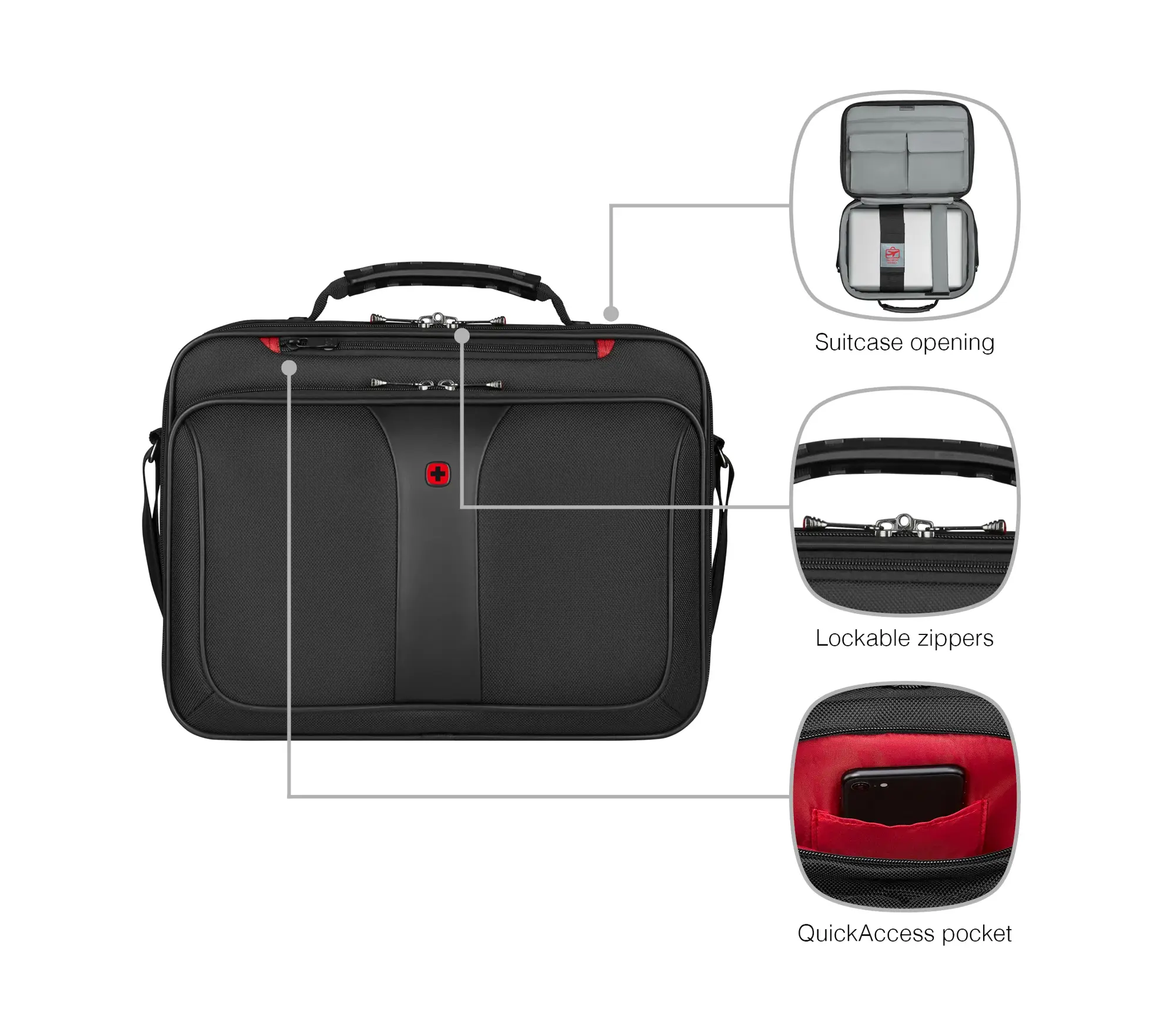 Glijd door de veiligheidscontrole op de luchthaven met deze zakelijke aktetas. Deze tas biedt ongeëvenaarde techniek en lichtgewicht comfort en is een onmisbare, stijlvolle opbergtas voor de drukke professional. Het gewatteerde laptopvak voldoet aan alle eisen voor de bescherming van uw apparatuur en de organizer voor essentiële spullen houdt de rest van uw spullen en apparatuur op orde. Dankzij de ritssluiting kunt u onderweg snel bij uw spullen en de afsluitbare ritsen bieden uitstekende beveiliging. Verstelbare, gewatteerde schouderbanden en gewatteerde handgrepen zorgen voor moeiteloos reizen.