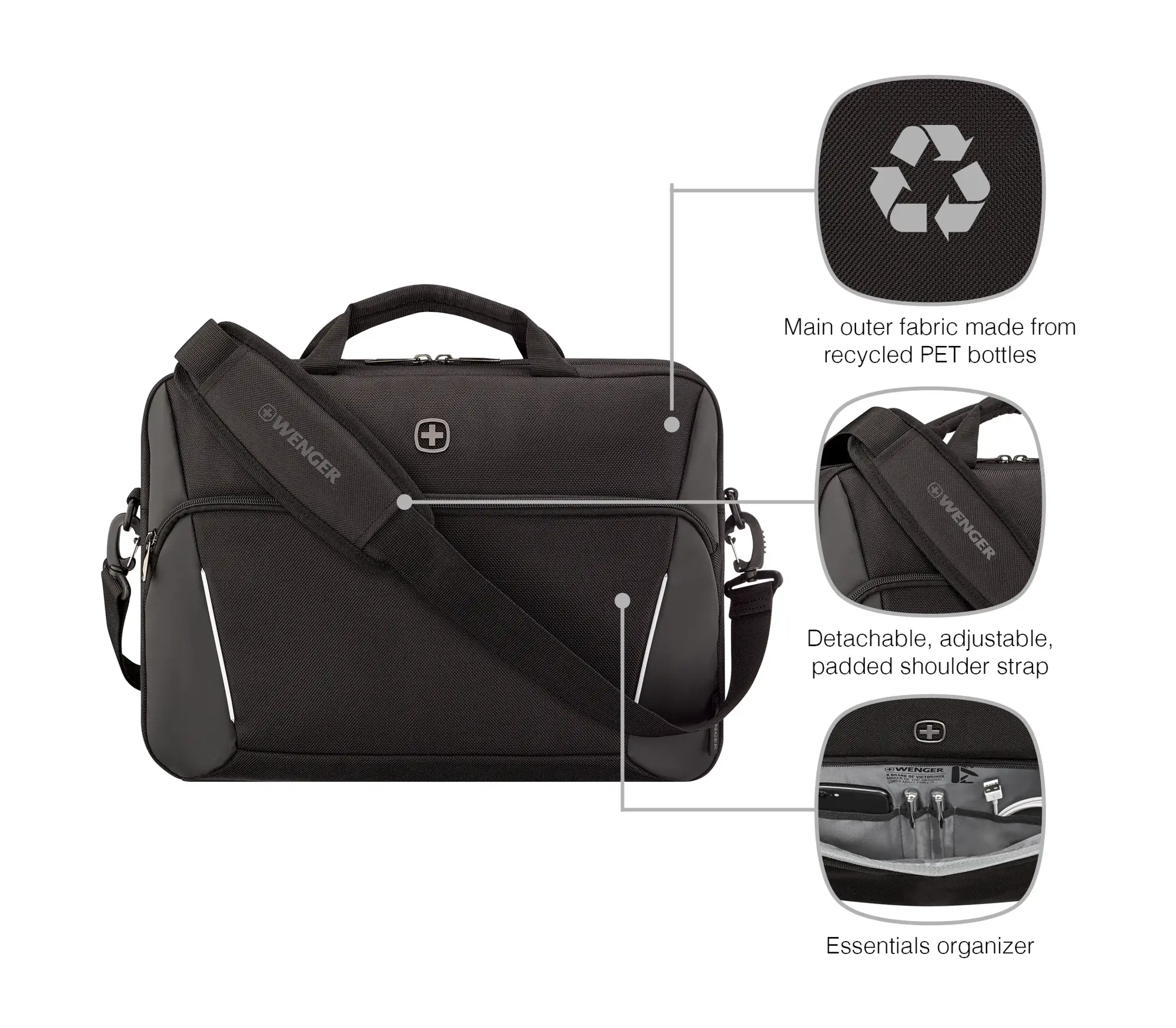 Geef je professionele look een upgrade met de XE Compact Brief 16 - een betrouwbare en functionele metgezel. Deze compacte tas is gemaakt van gerecyclede PET-flessen en heeft een 16-inch laptopvak en een 11-inch tabletvak in het ruime hoofdvak. Dankzij de dossierverdeler en de organizer voor essentiële spullen blijven je documenten en accessoires georganiseerd en gemakkelijk toegankelijk. Reizen met deze aktetas is een fluitje van een cent dankzij de doorvoerriem voor trolley, die stevig aan uw bagage kan worden bevestigd. De afneembare schouderriem en dubbele handgrepen bieden comfortabele draagopties.