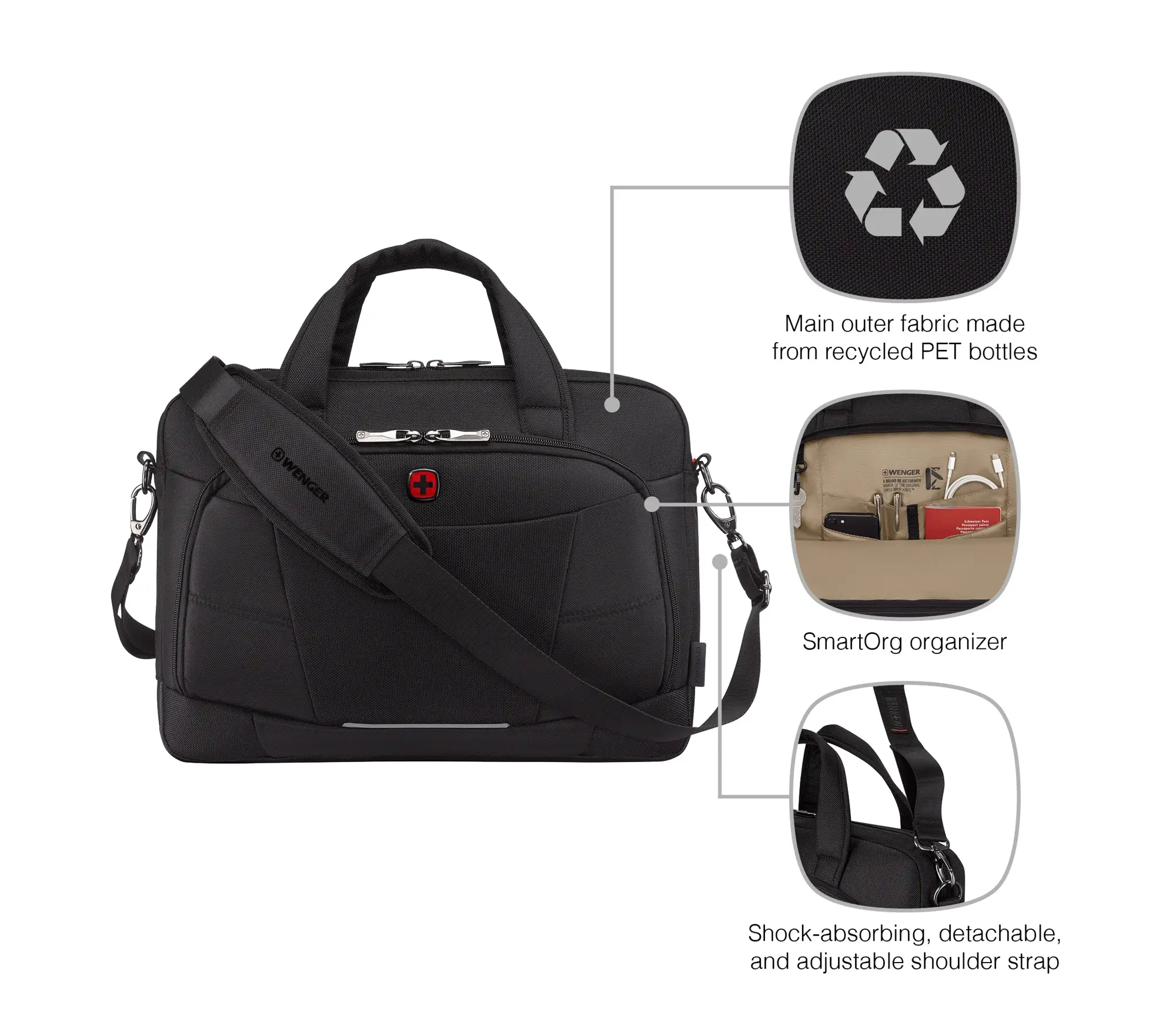 Die Altair Brief 14–16 rundet Ihren Business-Look ab. Die vielseitige Laptop-Aktentasche mit langlebigem Aussenmaterial aus recycelten PET-Flaschen kombiniert Stil und Funktionalität. Die Triple Protect Laptophülle schützt Laptops von 14″ bis 16″, das separate 10″ Tablet-Fach ist ein sicherer Platz für Ihr Tablet. Dank SmartOrg Organizer ist Ihr wichtigstes Zubehör unterwegs übersichtlich aufgehoben. Das Schnellzugriffsfach bietet schnellen Zugriff auf die Dinge im Inneren und der stossdämpfende Schulterriemen verspricht auch auf langen Wegen optimalen Komfort. Auf Reisen lässt sich die Aktentasche mit dem Trolleyriemen ganz einfach am Koffer befestigen.